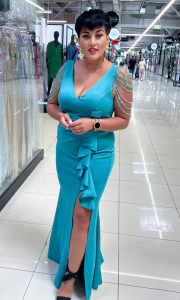 Zjawiskowa suknia wieczorowa zdobiona koralikami-kryształkami na ramionach. Dekolt sukni jest w kształcie litery V. Tył sukni ma także wycięcie w kształcie litery V. Sukienka ma wszyte miseczki, dzięki czemu nie wymaga dodatkowej bielizny. Mimo tego, głębokość wycięcia z tyłu pozwala także na założenie normalnej bielizny, która nie będzie widoczna.